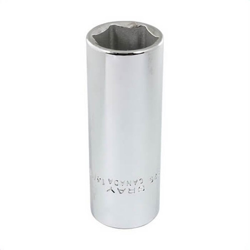 Gray Tools socket, deep, measurement system: imperial, 1/2 in drive, hex socket, 13/16 in socket, 3.07 in OAL, 1.14 in drive end width, 1.14 in socket end width, 6 points, 0.72 in bolt clearance depth, tool steel, polished chrome. Manufacturer Part Number: