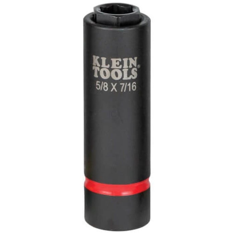 Single-ended impact socket with hands-free adjustment between 5/8 in and 7/16 in hex sizes. Deep socket with a 1/2 in drive is great for use in electrical and construction work. The high-torque, 6-Point design is easier to position and works with square fasteners.