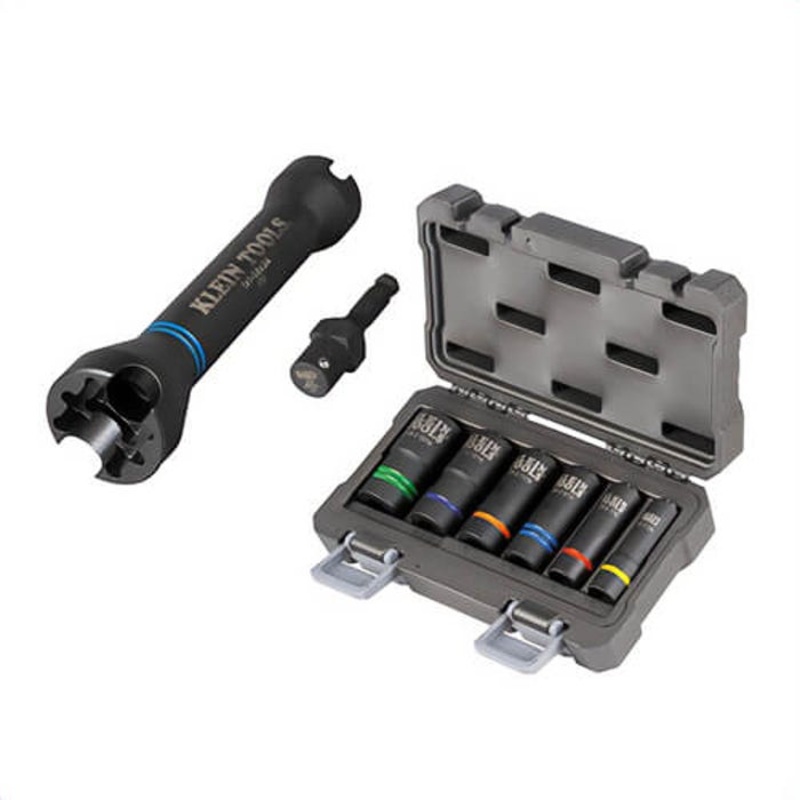 This Klein Tools Socket Set includes the 5-in-1 Impact Socket and the 2-in-1 Slotted Impact Socket Set, 6-Piece (Cat. No. 66090). The versatile 5-in-1 Impact Socket features three square socket sizes: 3/4 in, 1 in, 1-1/8 in and 2 alignment slots that can be quickly and easily converted for a variety of utility type applications. The 6-Piece Impact Socket Set consists of commonly used impact socket sizes used in utility and construction work. Includes two 3-in-1 sockets with an alignment slot to tighten and loosen most pole hardware.