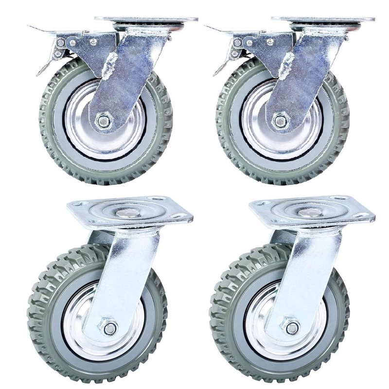 Brand: MatedaColor: SilverFeatures: 4 PACK Swivel Rubber Casters: 2PCS caster wheels with brake,2PCS Without Brake.8 Inch Plate Swivel Casters made from Steel structures and rubber body , is extremely hard wearing and resistant to dirt, also won't mark the