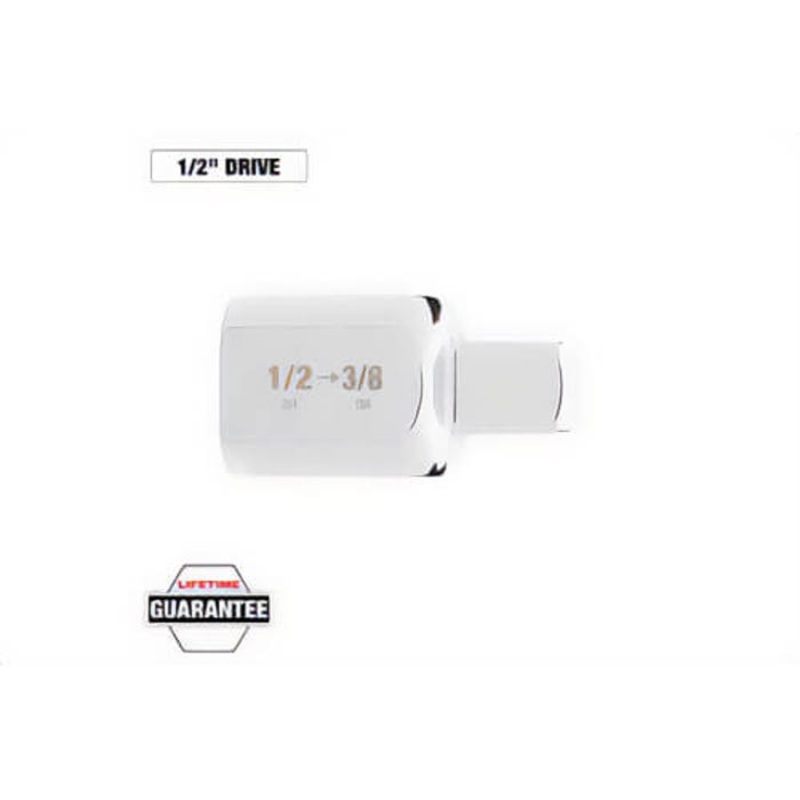 The 1/2 in drive 1/2 in F x 3/8 in Male adapter with Four Flat sides is designed from the ground up to be part of the most versatile socket family. Milwaukee adapters feature an innovative design with four parallel flat sides, which deter rolling and are wrench-compatible. The drive sizes are laser etched onto the adapter providing improved, easy-to-read visibility. Chrome plating offers corrosion and rust protection. All Milwaukee mechanics hand tools are backed by a lifetime guarantee.