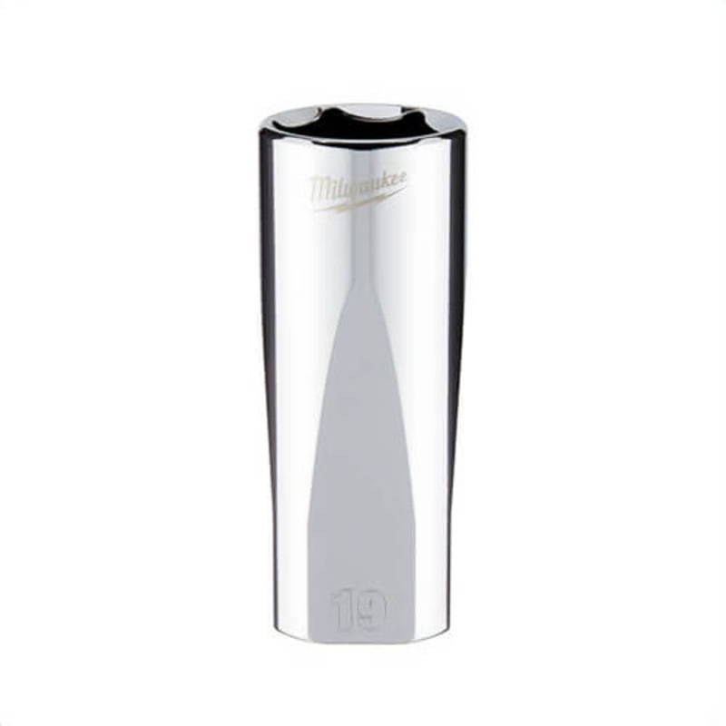 Milwaukee socket, measurement system: metric, 3/8 in drive, deep socket, 19 mm socket, 6 points, steel, polished chrome. Manufacturer Part Number: 45-34-0119 Manufacturer: Milwaukee Tool Brand Name: MILWAUKEE UPC: 045242566150 Length (in): 1.02 Width (in):