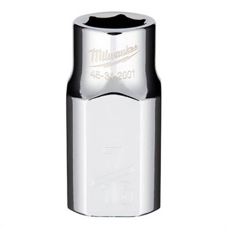 Milwaukee socket, no impact rated, measurement system: imperial, 1/2 in drive, standard socket, 7/16 in socket, 6 points, vanadium steel, polished chrome. Manufacturer Part Number: 45-34-2001 Manufacturer: Milwaukee Tool Brand Name: MILWAUKEE UPC: 04524261