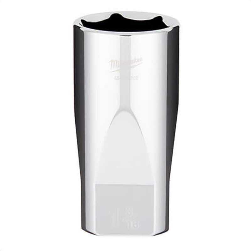 Milwaukee socket, no impact rated, measurement system: imperial, 1/2 in drive, deep socket, 1-3/16 in socket, 6 points, vanadium steel, polished chrome.