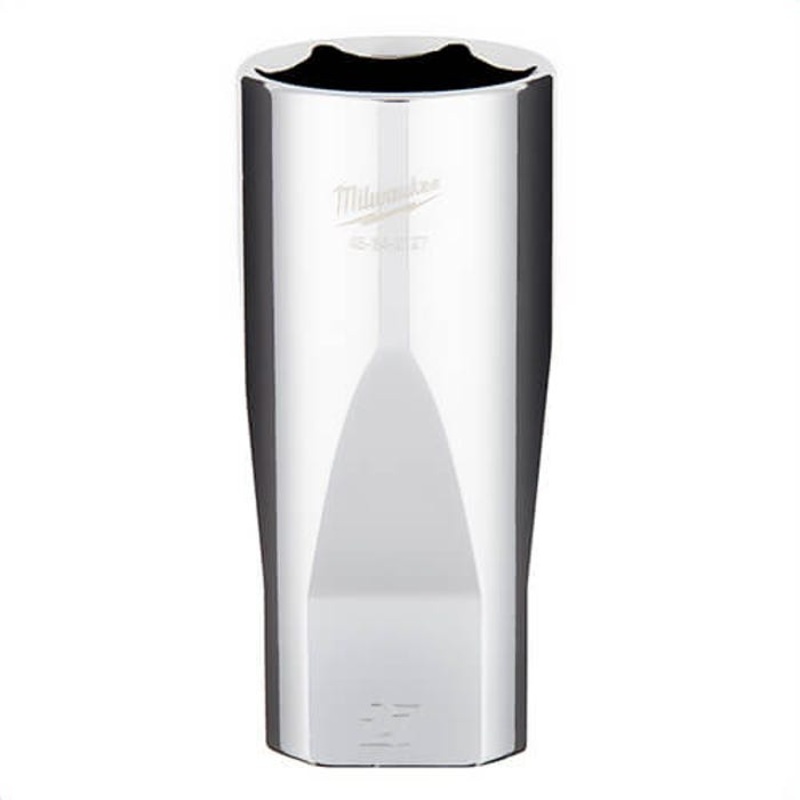 Milwaukee socket, no impact rated, measurement system: metric, 1/2 in drive, deep socket, 27 mm socket, 6 points, vanadium steel, polished chrome.