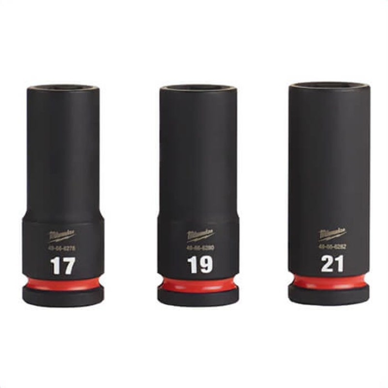 Milwaukee ShockWave Impact Duty socket set, deep, impact rated: yes, measurement system: metric, 3 pc, 6 points, included socket size: 17 mm, 19 mm and 21 mm, 1/2 in drive, hex socket shape, case, specifications met: ASME specified, for use with: 1/2 in dr