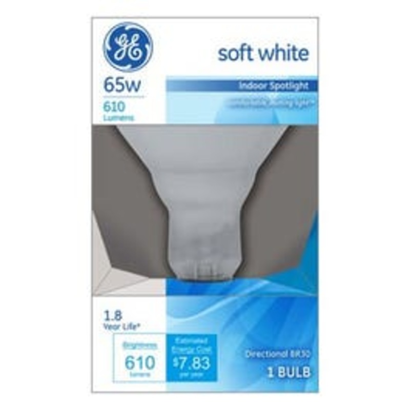 Ge, 65r/sp/mi, r30, 65w, 120v, miser, indoor reflector, spot light bulb, maximum overall length 5-3/8″, medium base, 610 lumens, 2,000 hours.