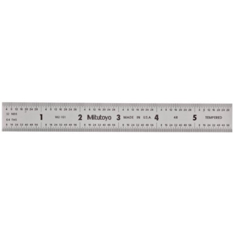 Brand: MitutoyoColor: ClearFeatures: Tempered stainless steelSatin chrome finishClear easy to see graduationsMeasurement Graduations: 1/8 inches, 1/16 inches, 1/32 inches, 1/64 inchesmodel number: 182-101Part Number: 182-101Details: Mitutoyo Steel Rule, 6"