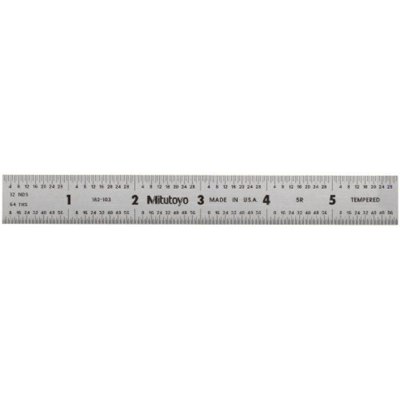 Brand: MitutoyoColor: ClearFeatures: Tempered Stainless SteelClear graduations on satin chrome finishmodel number: 182-103Part Number: 182-103Details: Mitutoyo Stainless Steel Rule, Length: 6", Graduations: (5R), (1/32, 1/64", 1/10", 1/100"), Thickness: 3/