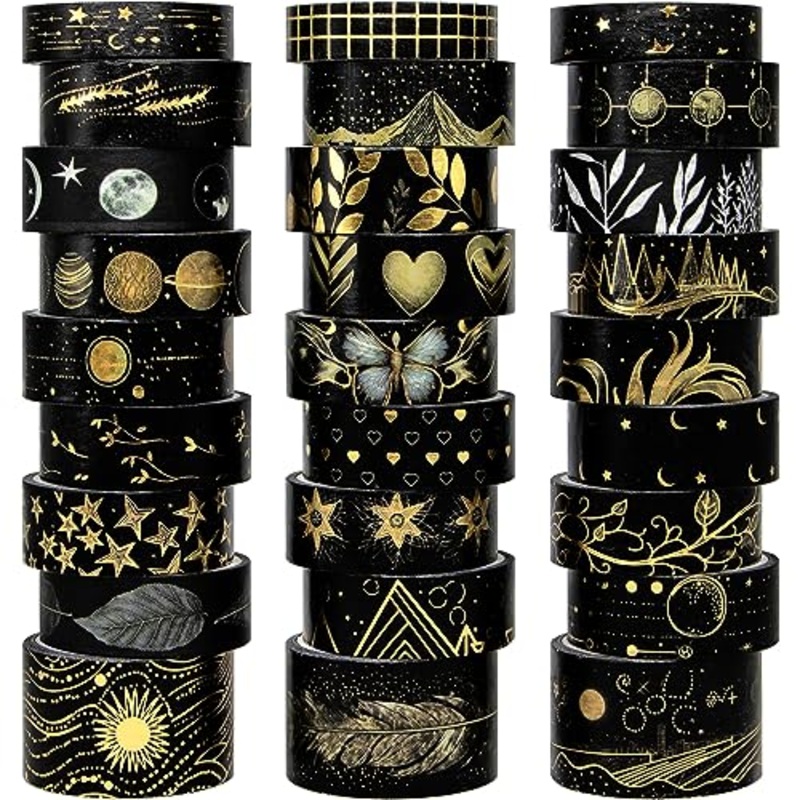 Brand: NANYNNUColor: WhiteFeatures: [27 Rolls black & gold designs] - Black background and gold lines make up this 27 rolls black washi tape set. Butterflies, hearts, leaves, feathers, stars, moons and more gold designs let you enjoy the ultimate luxury. I