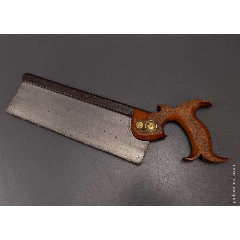14 point, 10 inch, rip. Straight and sharp. Fine handle Ca. 1850. Original bluing. PART OF A COLLECTION OF 1100 BACK SAWS WE HAVE ACQUIRED AND WILL BE LISTING EVERY DAY FOR THE NEXT YEAR.