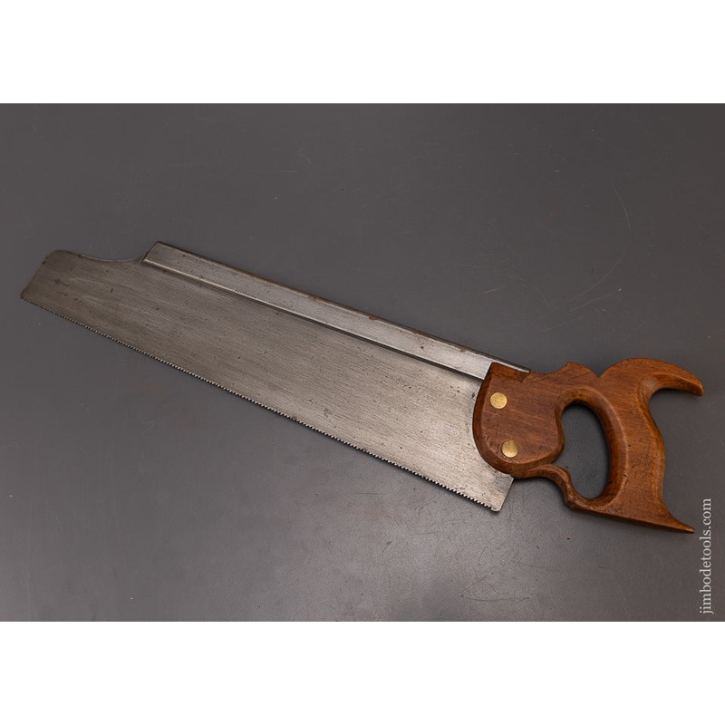 Clean, fine, no issues. 11 point, 16 inch, crosscut. Flawless handle. PATTERSON was a mark used by W.K. & C. PEACE of Sheffield. Also marked German Steel.PART OF A COLLECTION OF 1100 BACK SAWS WE HAVE ACQUIRED AND WILL BE LISTING EVERY DAY FOR THE NEXT YEA