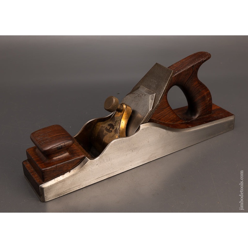 13 1/2 inches long. 2 1/2 inch Norris parallel iron is a post-war replacement. Front bun has a repair. NORRIS was established in 1860 and made the world’s finest planes until the 1950s. Considered the Rolls Royce of hand planes, a phrase coined in a Fine Woodworking Magazine article in the 1980s. In its day a Norris plane cost 4 times that of a comparable Stanley. The Norris has a much thicker iron and cap iron. It is a heavier plane. Also, the iron sits on wood as opposed to metal. All of these things prevent chatter and create a smoother cut. In 1913 Norris patented his famous adjuster which provides micrometer-like, smooth blade adjustment. In 1922 he patented an improvement to this adjuster. This adjuster allowed Norris to outdistance his product from his competitors. It is still copied today. Dating your NORRIS: Pre WW II vs Post WW II: Pre-war planes are better made with better materials. Brazilian rosewood infill. Dovetailed steel construction. Slightly thicker irons 3/16″ with larger Norris logos. 13/16″ wide to 5/8″. Earlier planes: Planes circa 1928 and earlier are found with finial lever cap screws and most often WARD irons. The 1928 Norris catalog shows both finial and flat top cap screws along with Ward and Norris irons. The two aforementioned adjuster patents will also aid accurate dating.