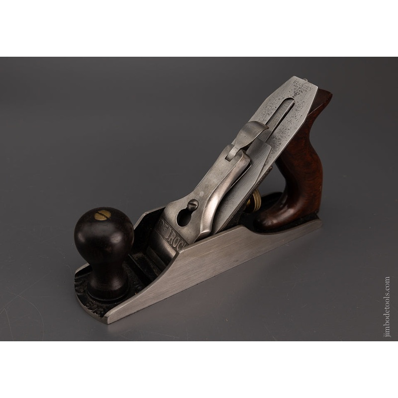 Type 6 ca. 1912-18. Clean, fine, no issues. 99% japanning. Fine rosewood. These “flat top” Bedrocks are highly sought after by users. They have the triple screw frog design, which allows you to adjust the frog while the iron is set, allowing you to tighten the mouth with utter precision. Bedrocks also have a frog that mates completely with the edge of the mouth, for a much more solid assembly. This eliminates chatter. Thus, the name Bedrock.