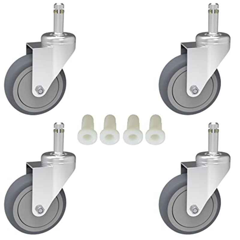 Details: Package Includes: 4 pack 3″ diameter Thermoplastic rubber wheels 4pcs 5/8″ OD plastic sockets Dimension: Caster wheels diameter: 3″ Stem diameter:7/16″ Stem length: 1-3/8″ The RILIDRI Hardware 3 inch TPR grip stem casters are great for fit for most of rubbermaid mop buckets. Also fit for carts, grill, dolly, workbenches, chair storage cart, kitchen utility cart, laundry cart, shop chair and furniture and institutional equipment, it provide resistance to oils and chemicals. The non-marking and non-marring wheels surface combines with superior endurance and quiet mobility. Soft rubber treads with ball bearing for instant swivel.