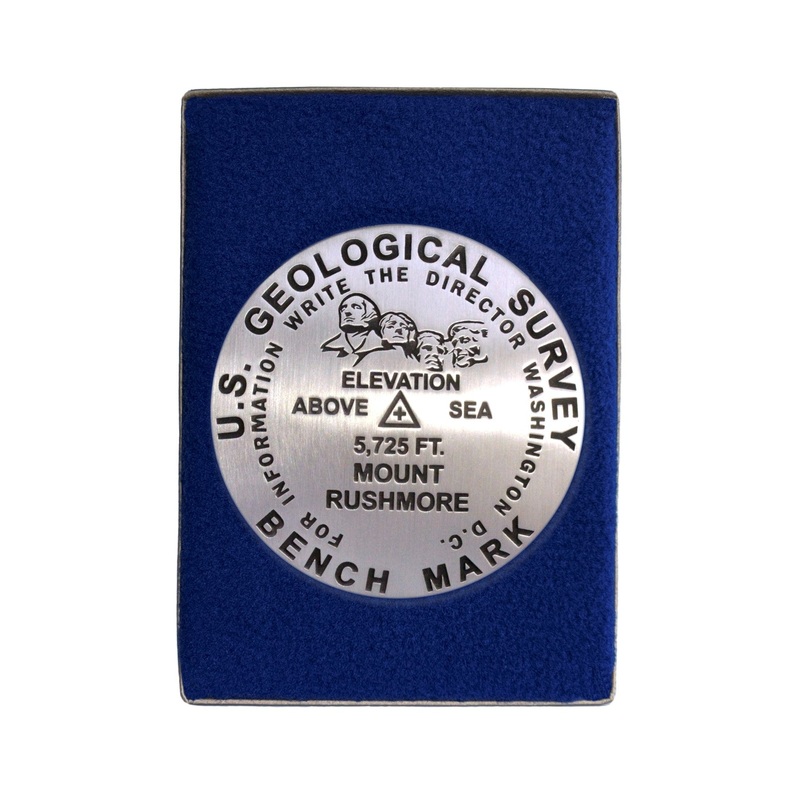 3 1/4 inch diameterCast in fine pewterButton Felt backingIn a fitted fleece interior of a clear-acrylic covered gift box.Place Name: Mount Rushmore Elevation: 5725 ft.Coordinates: N43 52' 30'' W103 22' 30'' Location: Mt. Rushmore National Park, South Dakot