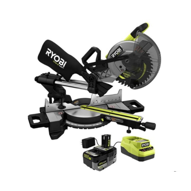 Details: Enhance your RYOBI 18V ONE+ System with the RYOBI 18V ONE+ HP Brushless 10 in. Sliding Compound Miter Saw Kit. ONE+ HP Technology combines a powerful brushless motor, advanced electronics, and HIGH PERFORMANCE lithium-ion batteries to deliver corded cutting performance, with up to 4,100 RPM for fast and accurate cuts. It has the ability to make up to 550 cuts per charge when using a 4.0 Ah HIGH PERFORMANCE Battery, and the sliding design provides maximum capacity for up to 12 in. cross cuts. Enjoy an extended miter range from 47 left and right to accommodate a wide variety of cuts, with 9 positive stops located at the most common cutting angles. This tool also features a 0 – 45 single bevel capacity, and a LED cutline indicator for precision cutting. Compatible with the RYOBI Universal Miter Saw QuickSTAND (Model A18MS01G, sold separately), you can take this saw on the go and cut anywhere. Best of all, it is part of the RYOBI 18V ONE+ System of over 280 Cordless Products that all work on the same battery platform. This brushless miter saw is backed by the RYOBI 3-Year Manufacturer’s Warranty and includes the 18V ONE+ HP brushless 10 in. sliding compound miter saw, 40T carbide-tipped blade, (2) material supports, carrying handle, work clamp, blade wrench, dust bag, and operator’s manual.