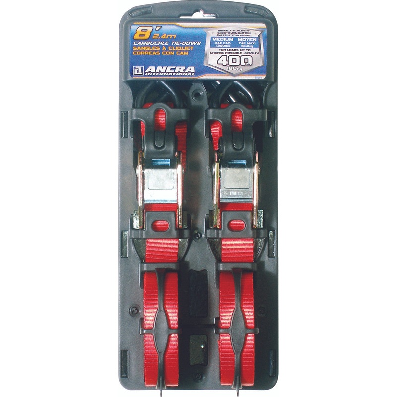 1 x 8 Cam Buckle StrapsScratch-resistant vinyl-coated S-hooksWorking Load Limit of 400 lbsAncra's cam buckle tie-down 2 pack includes a pair of highly durable 1-in. x 8-ft. cam buckle straps for securing a wide variety of light- to medium-duty cargo. The l