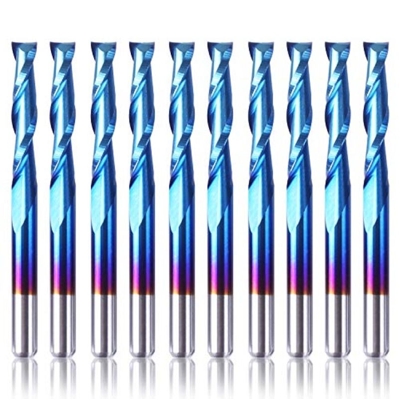 Brand: SainSmartFeatures: High Quality: Nano Blue Coating for extended tool life and performance. Perfect for Roughing operations, slots and more.Efficient Cuts: The 2-Flute Straight Router Bits have a mirror polish and large chip space which produces smoo