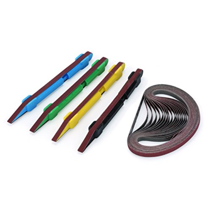 Brand: SANDING DETAILERFeatures: 24 Piece Finishing KitHexagon shaped for comfortThe 6-1/4" x 1/4" sticks are made of impact resistant plasticHolds 1/4" x 12-3/4" aluminum oxide belts24 Piece Finishing Kit includes 4 color coded sticks and 5 belts each in