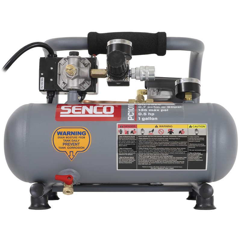 Details: The SENCO PC1010 compressor is a 1 HP peak, 1 Gallon, oil-less portable air compressor. At 20 lbs., this compressor is easy to carry and to use in a wide variety of applications.