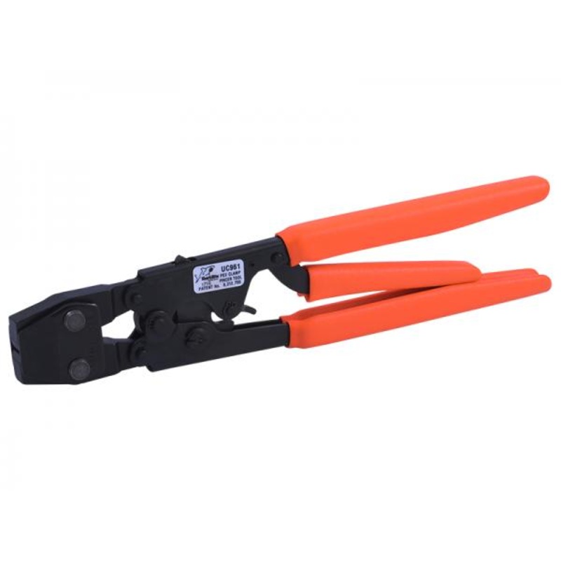 Compresses Stainless Steel Clamp Rings to secure PEX or PE-RT tubing to brass or poly crimp fittings. The 3-handle design version allows for one-handed gripping keeping the other hand free to hold a flashlight, ladder or pipe. One tool works with all size