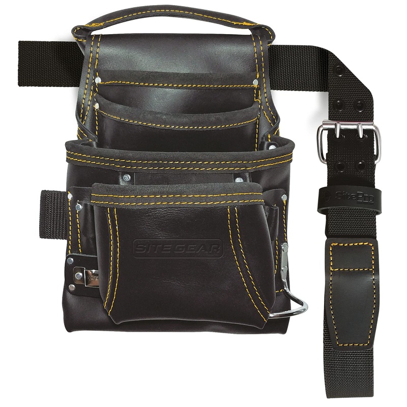 Details: The SITEGEAR 10113 Carpenter top grain leather nail and tool bag offers two (2) large main nail/tool pouches with double-gusset front pouch, two (2) upper pouches, and six (6) smaller outer pockets to hold your favorite tools such as speed square, nail sets, pliers, utility knife, pencils, etc. Swinging hammer ring holder and steel tape measure clip. Snap-lock pouch handle allows for easy belt adjustments and one-hand carrying.