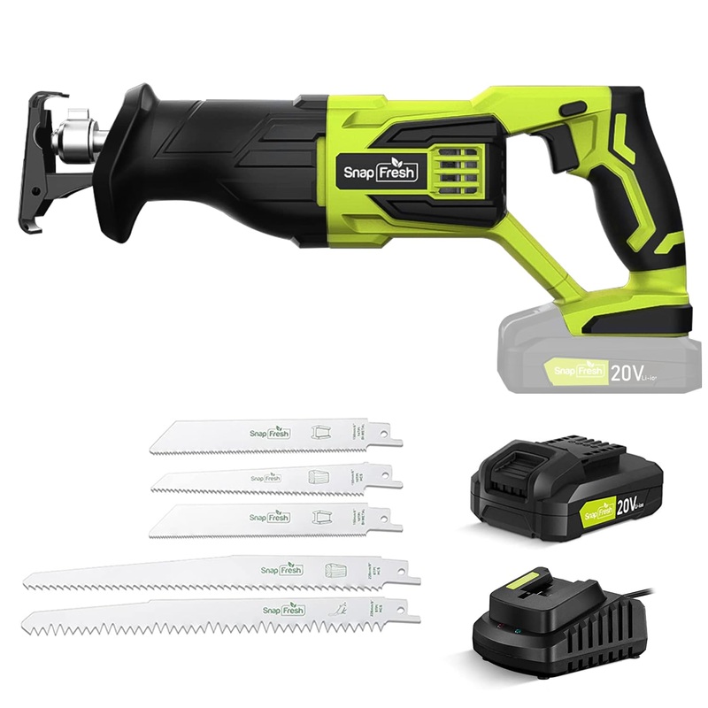Brand: SnapFreshColor: Green Cordless Reciprocating SawFeatures: Variable Speed & 1" Stroke Length- SnapFresh reciprocating saw delivers 1-inch stroke length for increasing efficiency and faster cutting speed. Variable-speed motor provides with superior ef