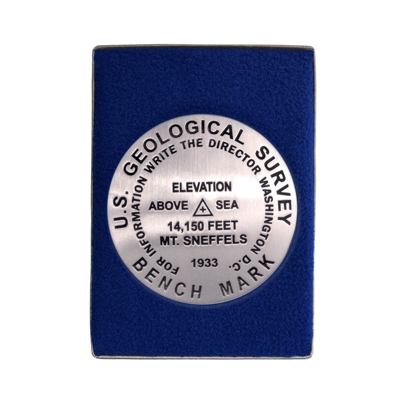 3 1/4 inch diameterCast in fine pewterButton Felt backingIn a fitted fleece interior of a clear-acrylic covered gift box.Place Name: Mount Sneffels Elevation: 14,150 ft.Coordinates: N38 00' 12'' W107 47' 30'' Location: Sneffels Range, Colorado, USA MarkerS