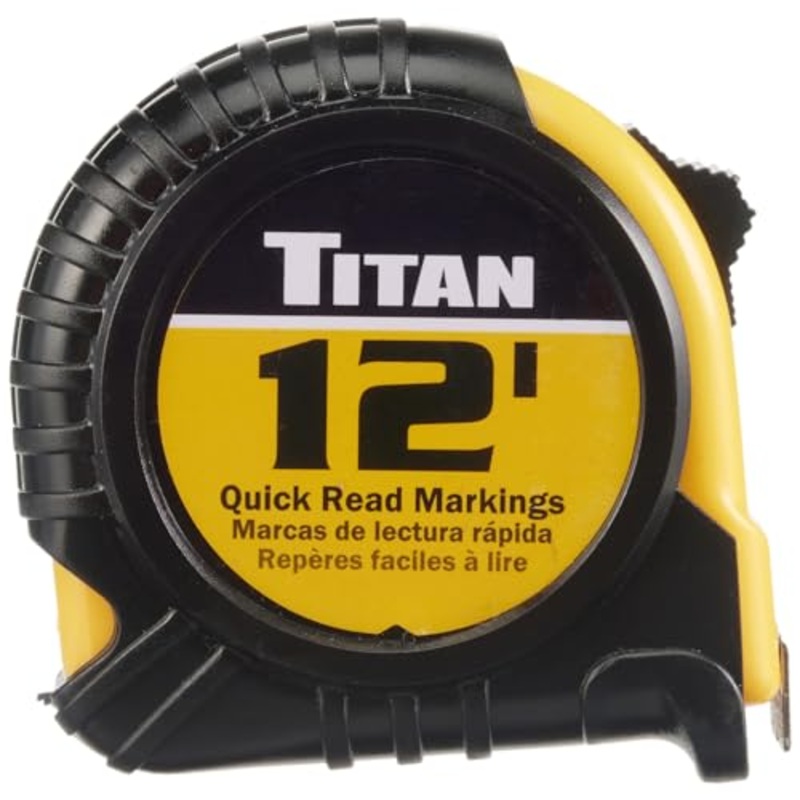 Brand: TitanColor: FactoryFeatures: 12' long measuring tape with quick-read and standard markings5/8 inch wide blade shows easy, quick-read markings for 1/8, 1/4, 3/8, 1/2, 5/8, 3/4 and 7/8 inch marksTough, impact resistant plastic caseErgonomic cushion gr