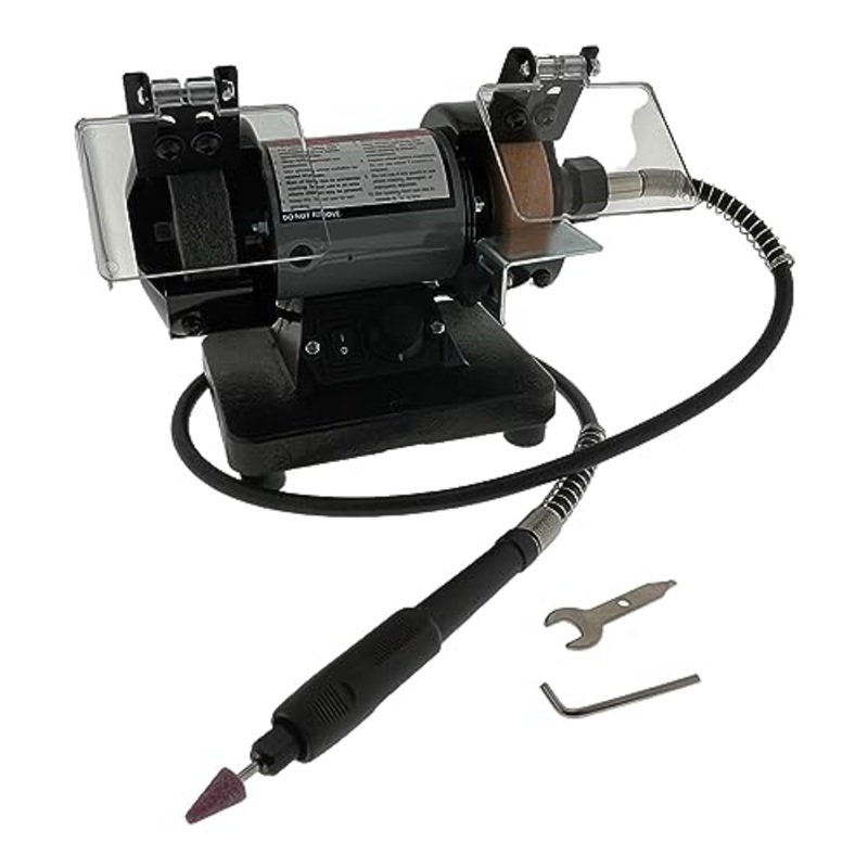 Details: TruePower 199 Mini Multi Purpose Bench Grinder and Polisher with Flexible Shaft, Tool Rest and Safety Guard, 3-Inch