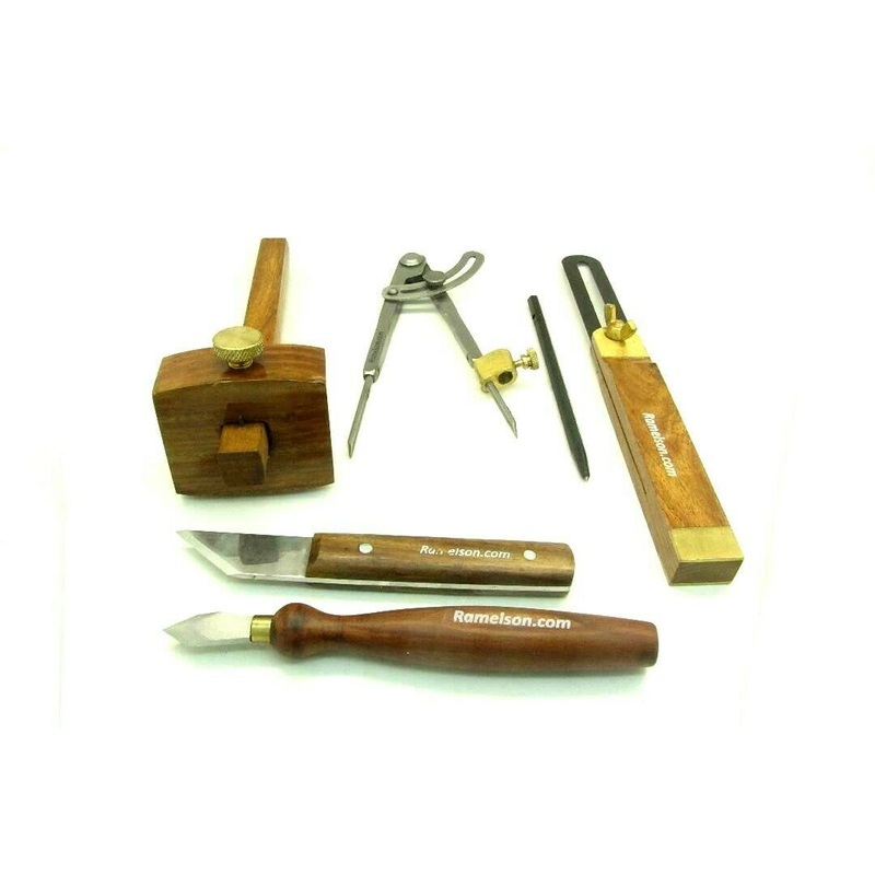 Brand: UJ Ramelson CoColor: BrassFeatures: SIX GREAT WOOD CARVING TOOLS IN EACH ORDER: 6-piece Complete Professional Wood Marking/Striking Carving Drawing Knife Set with Sliding Bevel and Mortise/Marking Gauge & Wing Compass with Carbide ScribeMARKING GAUG