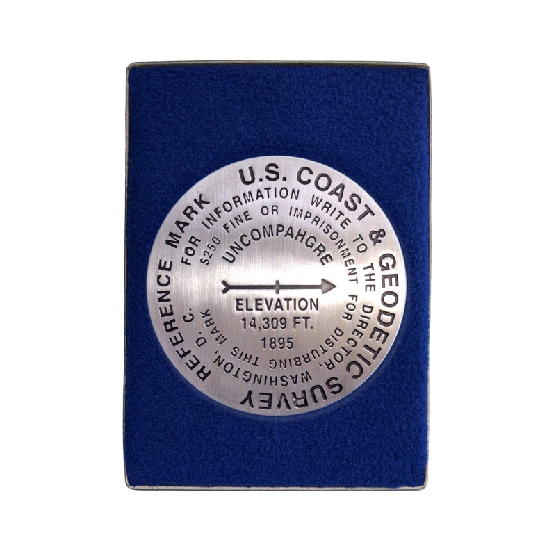 3 1/4 inch diameterCast in fine pewterButton Felt backingIn a fitted fleece interior of a clear-acrylic covered gift box.Place Name: Uncompahgre Peak Elevation: 14,309 ft.Coordinates: N38 04' 18'' W107 27' 41'' Location: San Juan Range, Colorado, USA Marke