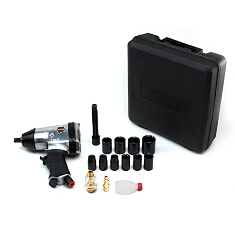 Details: Includes: 10pcs air impact sockets 9, 10, 11, 13, 14, 17, 19, 22, 24, 27mm 1pc. 5″ extension bar 1pc. Oil pot 1pc. Hex wrench 1pc. Nipple 1pc. Plastic case 1pc. Mini oiler Built in regulator to prevent over torquing. Ideal for tire changing, shock and spring works and other automotive works.