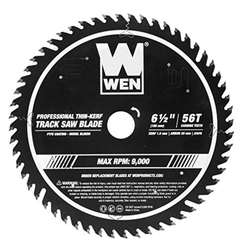 Details: Remember when you had a smooth and powerful cut? The WEN 6. 5-Inch 56-Tooth Carbide-Tipped Professional Saw Blade provides reliable and accurate performance, maintaining its straight shape and sharp edges for longer than the competition. The machine-cut carbide-tipped teeth feature an ATAFR (Alternate Top Alternate Face with Raker) design, making cuts faster and smoother then alternative saw blades. Abrasion-resistant non-stick PTFE coating maximizes performance and lifespan. The 20 mm arbor allows for compatibility with the majority of 6. 5-inch track saws on the market, including the WEN CT1065 Plunge Cut Track Saw. This lightweight, ultra-thin blade provides maximum efficiency during operation, leaving behind a kerf a mere 1/17 of an inch wide (1. 5 mm). Its time to get reliable and powerful performance with a WEN Saw Blade. Remember when you had a blade that lasted? Remember WEN.
