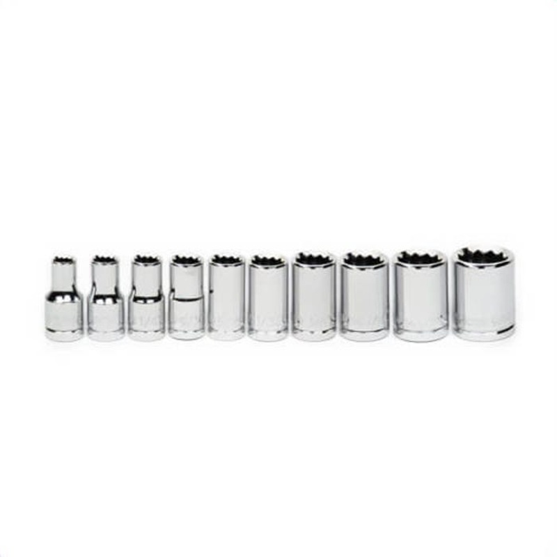 Williams socket set, series: Supertorque, measurement system: imperial, 10 pc, 12 points, included socket size: 3/16 in, 1/4 in drive, clip rail, polished chrome.