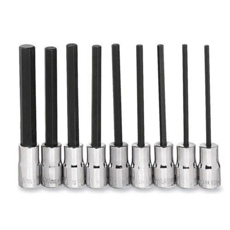 Includes: MA-3LA 3/32 in, MA-3-1/2LA 7/64 in, MA-4LA 1/8 in, MA-4-1/2LA 9/64 in, MA-5LA 5/32 in, MA-6LA 3/16 in, MA-7LA 7/32 in, MA-8LA 1/4 in and MA-10LA 5/16 in Long Hex Bit Sockets and Clip Rail