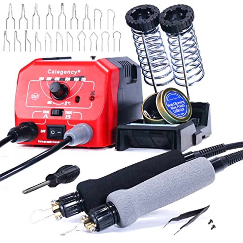 Brand: CalegencyColor: RedFeatures: [LESS WAITING]: Different from the traditional wood burner kit, its new technology, 10s fast heating, 2 pens stand by, no need to change nibs frequently and less waiting.[Ergonomical Design]: Burning wood tool comes with