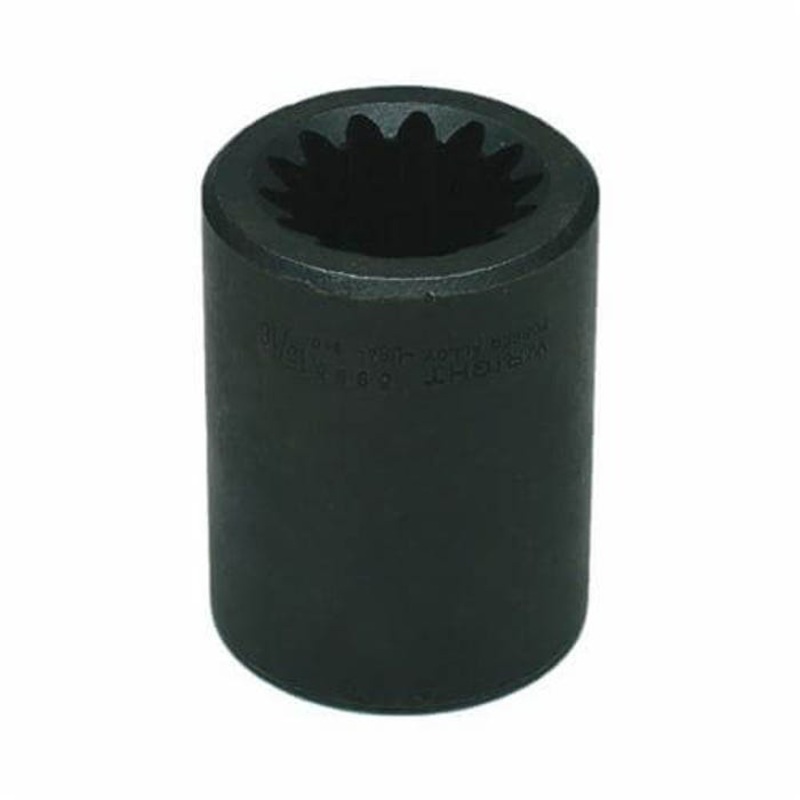 Wright Socket, Shape IV, Impact Rated: Yes, Measurement System: Imperial, Square x Spline Drive, #5 Drive, 13/16 in Socket, 3-1/16 in Overall Length, 3/4 in Opening Depth, 2-3/8 in Drive End Width, 1-25/32 in Socket End Width, Pin Locking, Alloy Steel, Bla