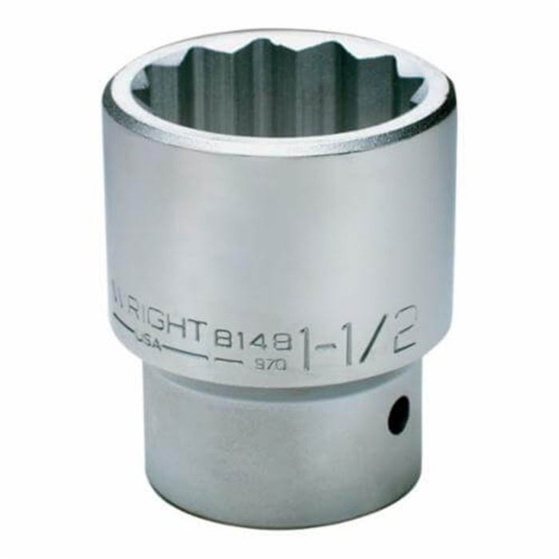 Wright Socket, Shape III Standard Length, Series, Measurement System, Square Drive, Drive Size, in 1, Socket Size, in 2-3/4, 3-13/16 Overall Length, Opening Depth in, in 1-3/4, 2-43/64 Drive End Width, Socket End Width in, in 3-23/32, Ball Locking, Number of Points, Bolt Clearance Depth, Alloy Steel, Finish